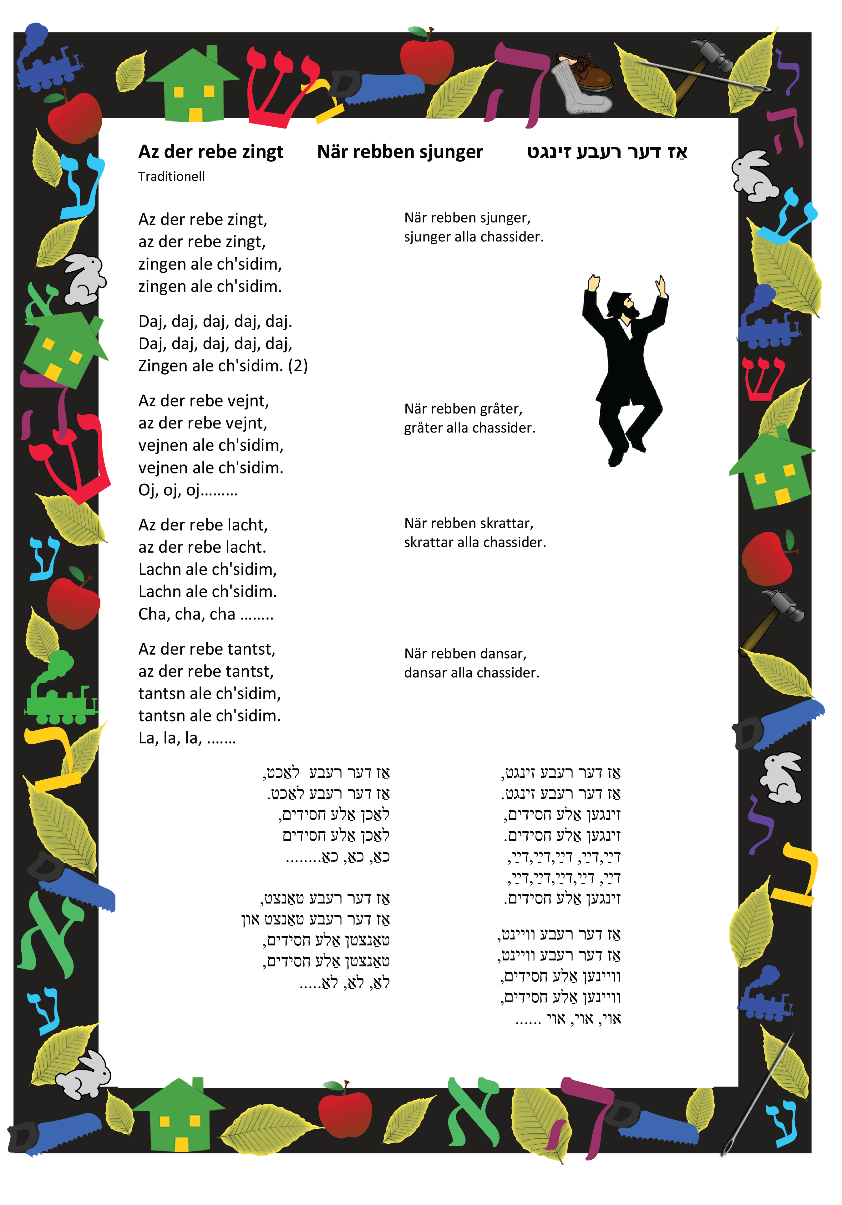 Detta är en mycket populär sång, som de flesta, som kan lite jiddisch, kan orden till. Den sjungs vanligtvis inte med rörelser, men med överdrivet minspel och beskrivande ljud, som t ex höga skratt, då rebben skrattar eller snarkningar, då rebben sover. Man kan utöka rebbens aktiviteter helt fritt. Förutom att han sjunger, gråter, skrattar och dansar, kan han t ex sova (shloft/shlofen), äta (est/esen), dricka (trinkt/trinken) och tänka (tracht/trachtn). Hitta gärna på egna rörelser till nya verb!