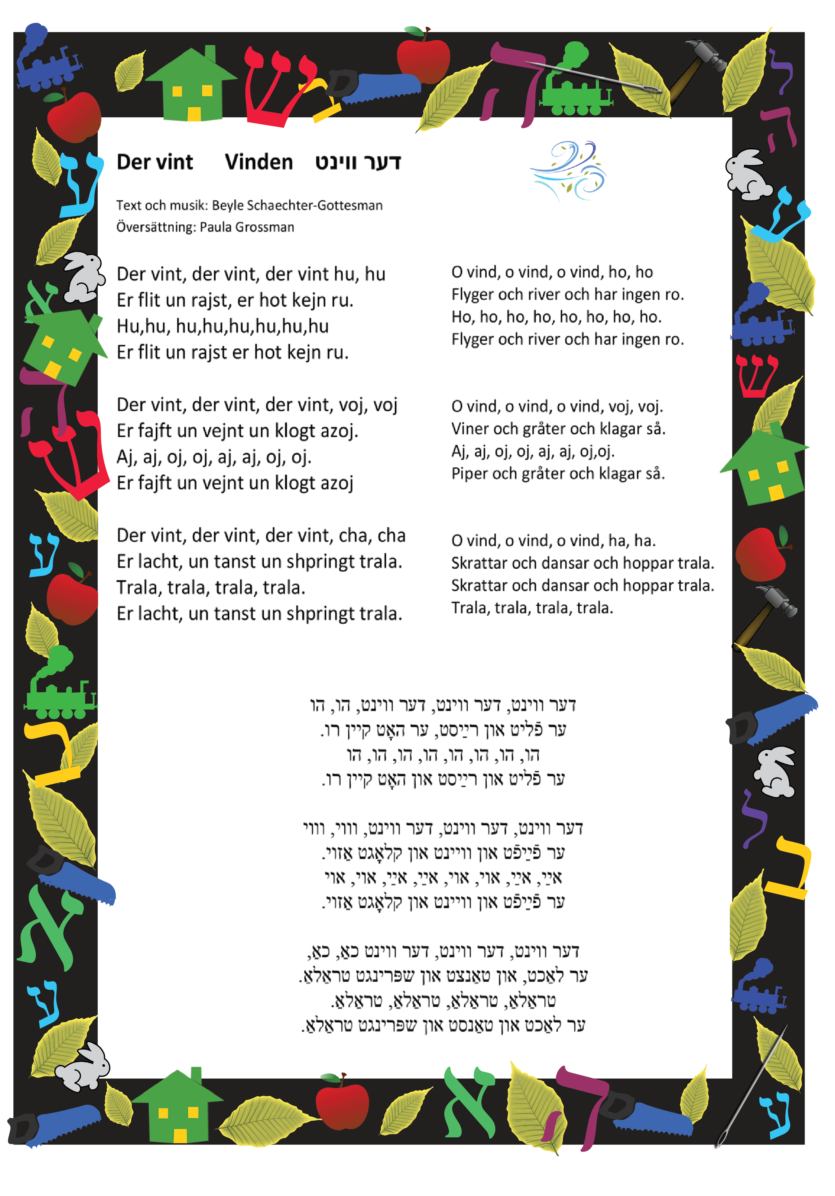 Der vint ingår i Beyle Schaechter-Gottesmans sångsamling “Fli mayn flishlang”. Barnen kan få varsin stor sjal, som de dansar med, som Heléne, i vind-sången.